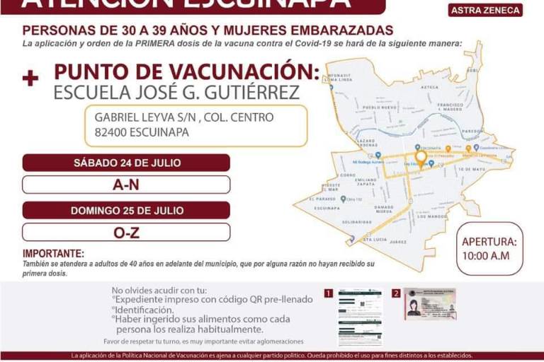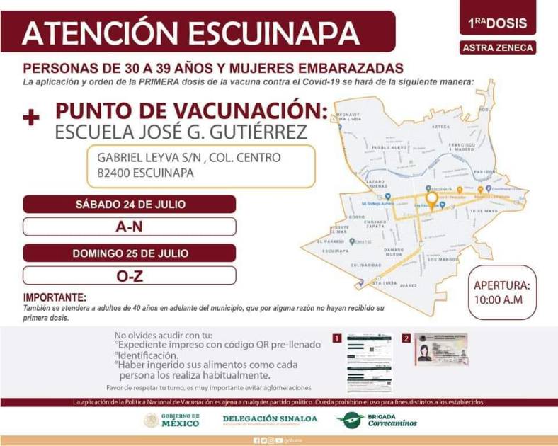 En la primaria José G. Gutiérrez el sábado 24 de julio les corresponde a las letras A-N, y el domingo 25 de julio a las letras de la O a la Z, también se aplicará primera dosis a adultos mayores de 40 años que por alguna razón no se hayan vacunado y a mujeres embarazadas.