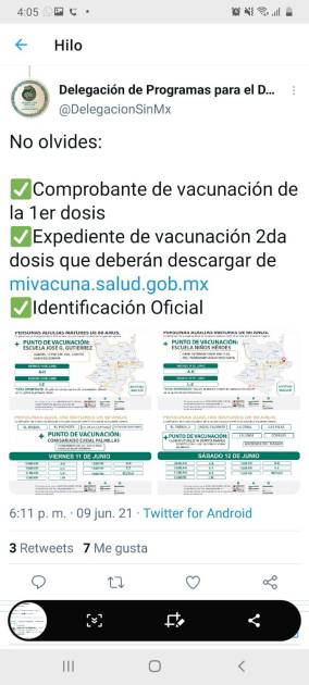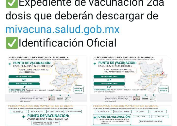 La Delegación informa que es importante llevar el comprobante de la primera dosis que se aplicó, el expediente de vacunación de segunda dosis que se deberá descargar de mivacuna.salud.gob.mx y la identificación oficial.