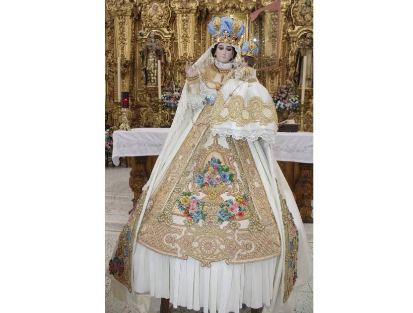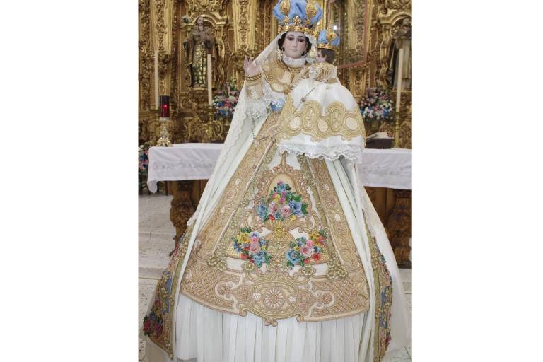 EL ROSARIO._ La inspiración del vestido donado este miércoles para Nuestra Señora del Rosario fue, de acuerdo a los donantes, la tradición de “las Marías”, práctica donde niñas ofrecen flores a la Madre de Dios durante mayo.