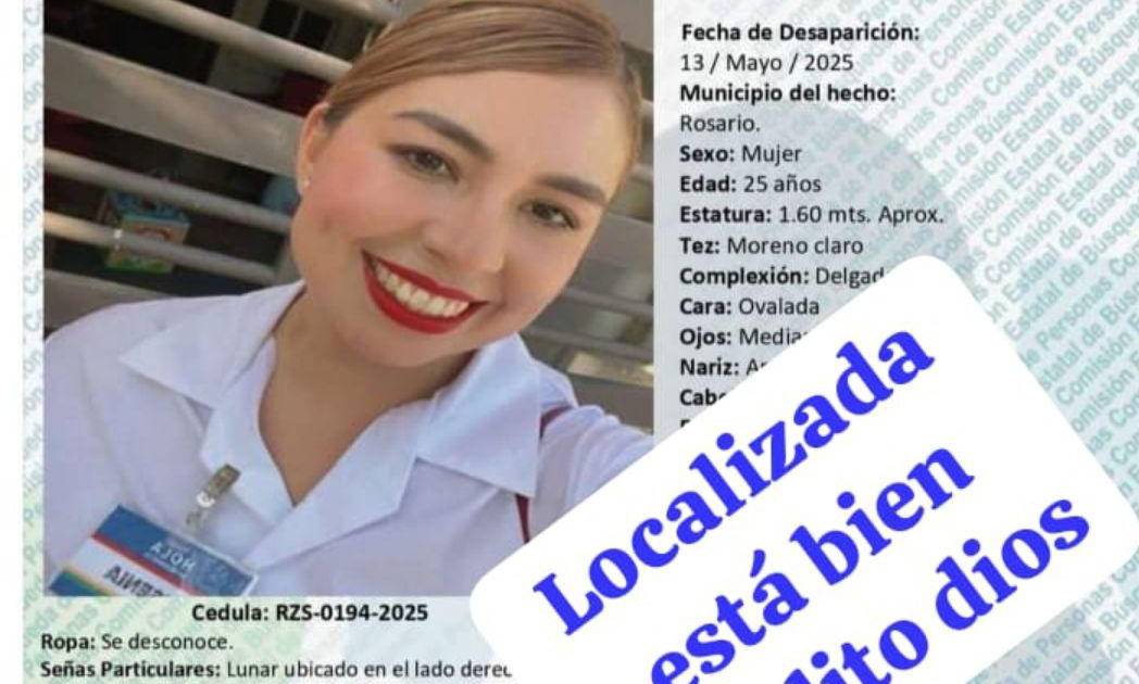 EL ROSARIO._ “Mil gracias a todos los que nos ayudaron a compartir, bendito Dios está bien”, son las palabras que acompañan a la imagen de la ficha de búsqueda de la joven Yesenia Guadalupe Loya Zamora, quien ya fue localizada este viernes.