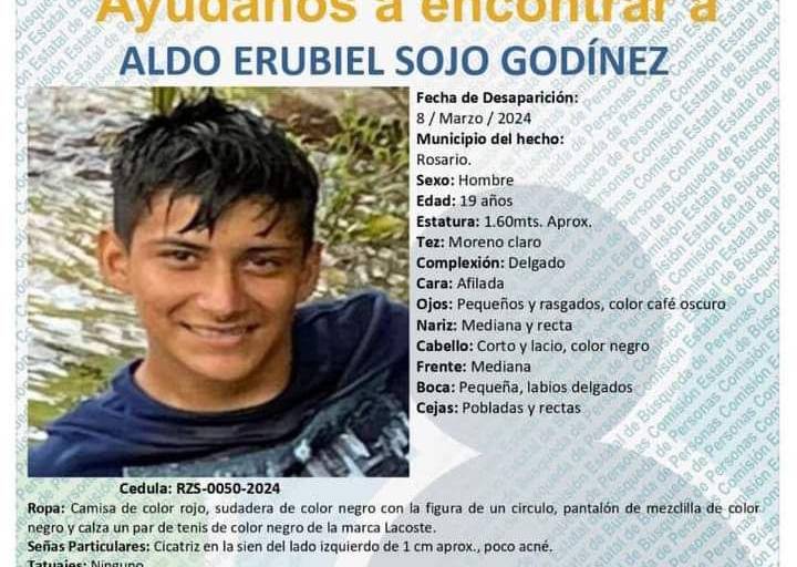 EL ROSARIO._ A poco más de un año de que el joven, en ese entonces de 19 años, Aldo Eribiel Sojo Godínez desapareció al transitar por el municipio en un camión pasajero, familiares piden ayuda para dar con su paradero.