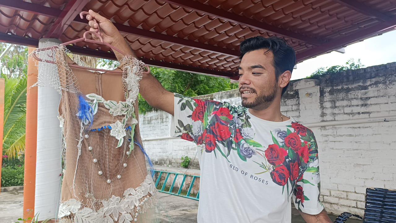 “Me inspiré en Escuinapa y así se llama este vestido, quería algo que reflejará la playa, me gusta ver la gente pescar, cuando avientan la atarraya y ver cómo se expande la red, de ahí me agarré para crear este diseño”, expresa el joven diseñador.