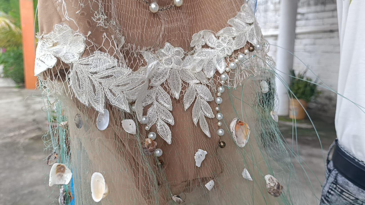 Entre la red cosió caracoles y elementos del mar, perlas y retazos de tela de seda, como pequeños rombos para que su modelo, que es su hermana María José, pudiera caminar y mostrar el vaivén de las olas del mar.