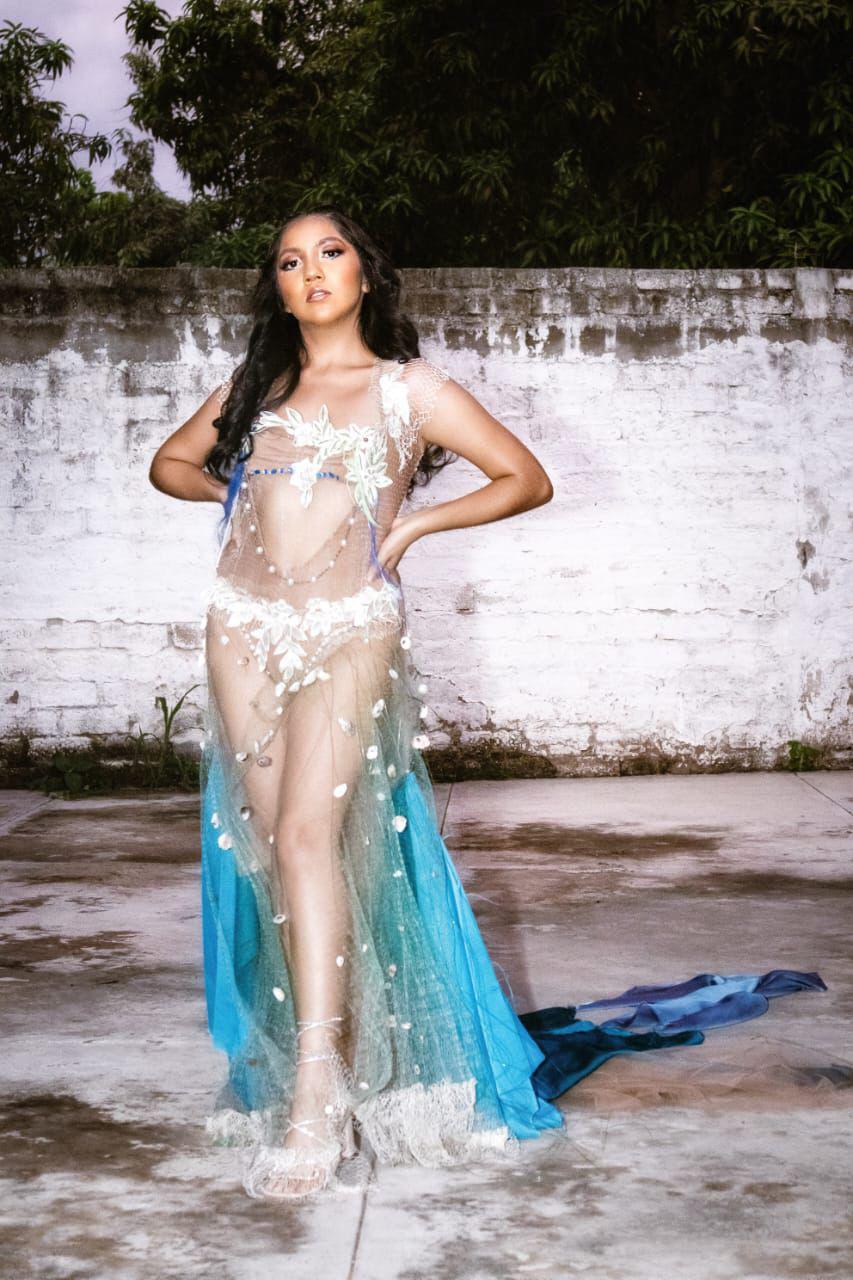 “Me inspiré en Escuinapa y así se llama este vestido, quería algo que reflejará la playa, me gusta ver la gente pescar, cuando avientan la atarraya y ver cómo se expande la red, de ahí me agarré para crear este diseño”