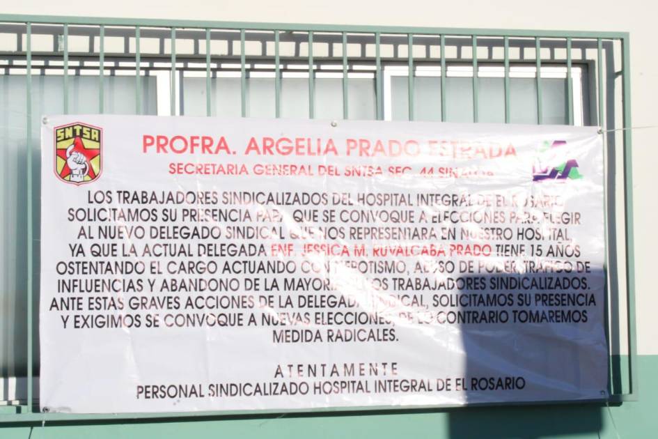 En la manta que apareció en la fachada del nosocomio se señalaba que la actual delegada, Jessica M, Rubalcava Prado, “tiene 15 años ostentando el cargo actuando con nepotismo, abuso de poder, tráfico de influencias, abandono de la mayoría de los trabajadores”.