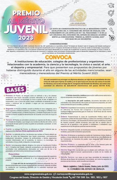 ESCUINAPA._ El H. Congreso del Estado de la 64 Legislatura a través del Ayuntamiento de Escuinapa invita a jóvenes a participar para recibir el Premio al Mérito Juvenil 2023.