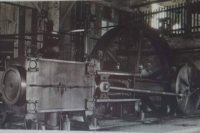 “Fotografía hacia el año de 1906, de la máquina de vapor Corliss de Minas del Tajo, que fue una de las innovaciones técnicas de las minas del Rosario al iniciar el siglo 20”, dijo el Cronista.