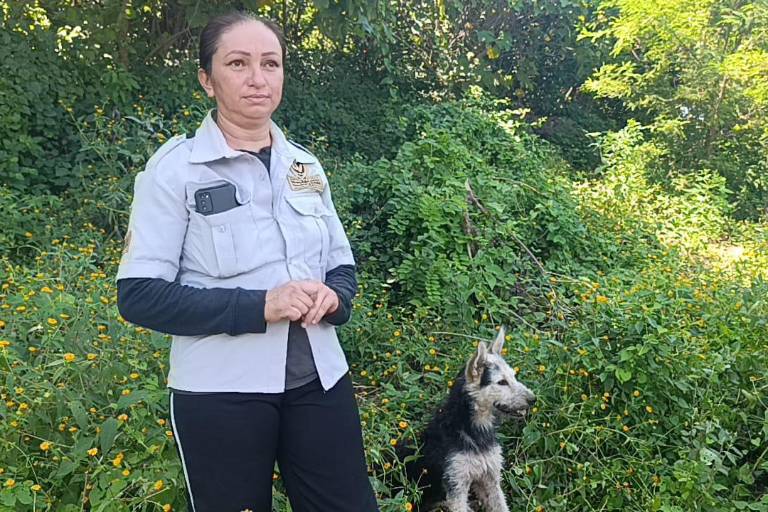 Donde Laura se mueve, ‘Oso’, un perro criollo, va con ella, atento a las necesidades que se tengan, olfateando a la gente, pendiente también de cuidar a todos.