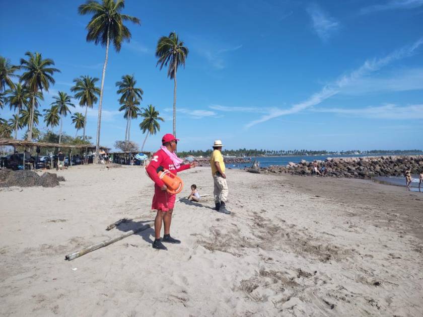Toledo Bustamante señaló que Protección Civil está con 22 elementos en playas, desplegados en Las Cabras, La Tambora, Las Lupitas y Teacapán, de 8:00 de la mañana hasta las 18:00 horas, con el objetivo de brindar la mayor seguridad posible a quienes estén disfrutando de sus vacaciones en estos lugares.