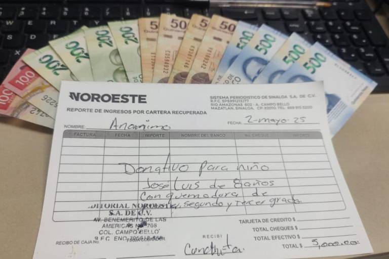 EL ROSARIO._ De nueva cuenta una fiel lectora anónima de Noroeste brinda ayuda a quien lo necesita. Esta vez donó 5 mil pesos para ayudar en el tratamiento médico al niño José Luis, de 8 años, quien sufrió quemaduras de primer, segundo y tercer grado, en Rosario.