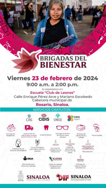 ROSARIO._ Este viernes 23 de febrero, llegará a Rosario la Jornada del Bienestar del DIF Sinaloa, encabezado por Eneyda Rocha Ruiz, e invitan a la ciudadanía rosarense a participar en los servicios que serán ofrecidos.
