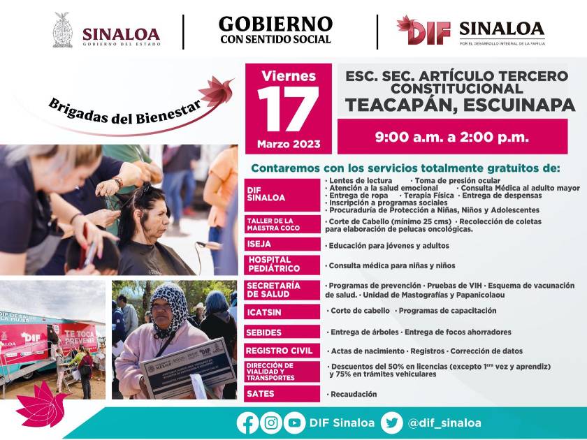 ESCUINAPA._ Este viernes 17 de marzo llegarán las ‘Brigadas del Bienestar’ del Sistema DIF Sinaloa al Puerto de Teacapá, con todos sus servicios multidisciplinarios y gratuitos, informó la Presidenta del DIF Escuinapa, Blanca Nereida Alvarado García.