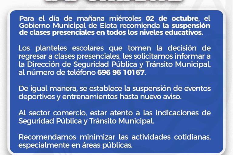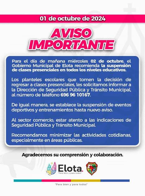 “Para el día de mañana miércoles 2 de octubre, el Gobierno Municipal de Elota recomienda la suspensión de clases presenciales en todos los niveles educativos”.