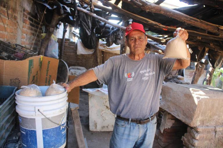 EL ROSARIO._ Con el tostado de maíz en hornilla a fuego de leña y su posterior molienda, Manuel Isidro Orrante García ha dado continuidad a la producción artesanal de pinole en Cacalotán, Rosario, durante ocho temporadas, tras los problemas de salud que enfrentó su hermana.