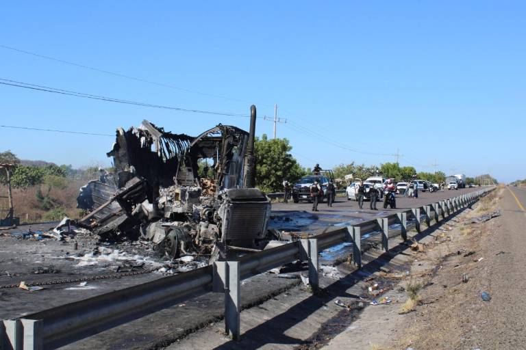 ESCUINAPA._ A más de dos días de la ola de violencia en Sinaloa por la captura de Ovidio Guzmán, aún permanecen vehículos quemados obstruyendo la circulación a unidades en el kilómetros 202, del carril de sur a norte de la carretera libre Mazatlán-Tepic, a la altura de La Loma Atravesada y de la Guardia Nacional.