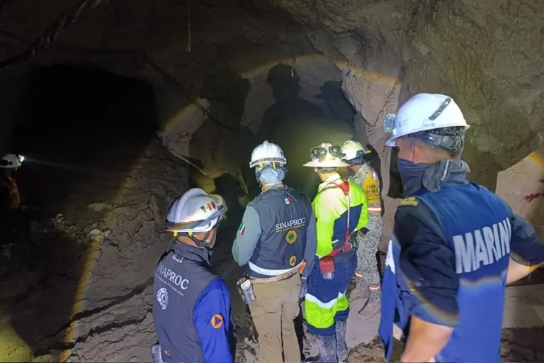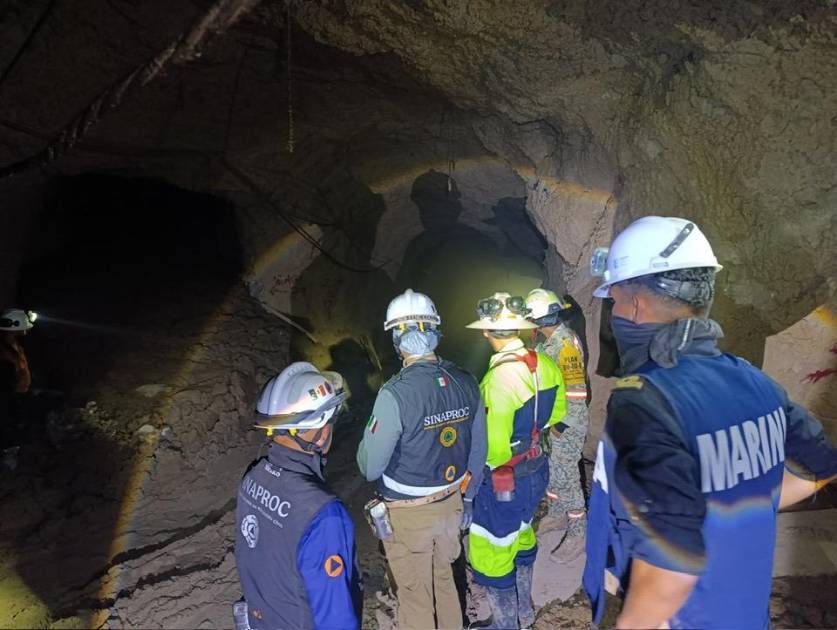 Personal de la Coordinación Nacional de Protección Civil recorre el interior de la mina en Rosario