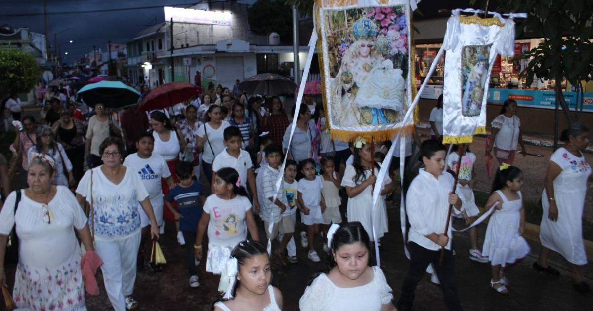 EL ROSARIO._ Con alegría, sus atuendos blancos y con el clima lluvioso en contra, niños peregrinaron en el segundo día del novenario en honor a Nuestra Señora del Rosario.
