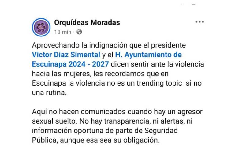 ESCUINAPA. Ante el posicionamiento de defensa hecho a favor de la Presidenta Claudia Sheinbaum por parte del Alcalde Víctor Manuel Díaz Simental, el colectivo Orquídeas Moradas lo llamó a tener la misma defensa por las mujeres del municipio.