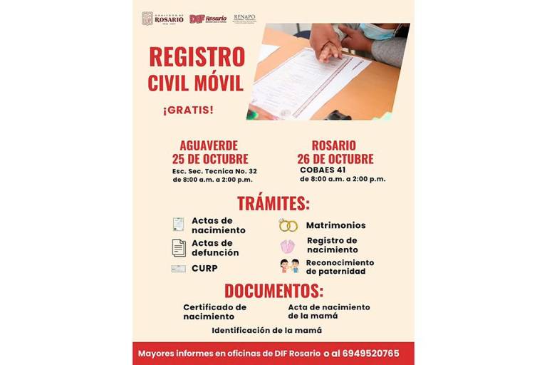 EL ROSARIO._ Con la finalidad de acercar servicios y trámites de identidad legal, el Gobierno Municipal de Rosario a través del Sistema DIF Municipal y en coordinación con Registro Civil estatal, llevarán a cabo dos jornadas de registro en la cabecera municipal y en la sindicatura de Agua Verde.