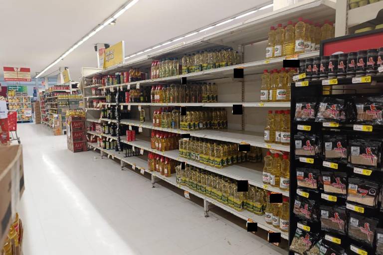 “Digamos que se tienen siete días de retraso en mercancía de abarrotes, diario llegaba un tráiler, pero ya son siete días que no, por eso se observan vacíos los estantes”, dijo un empleado.
