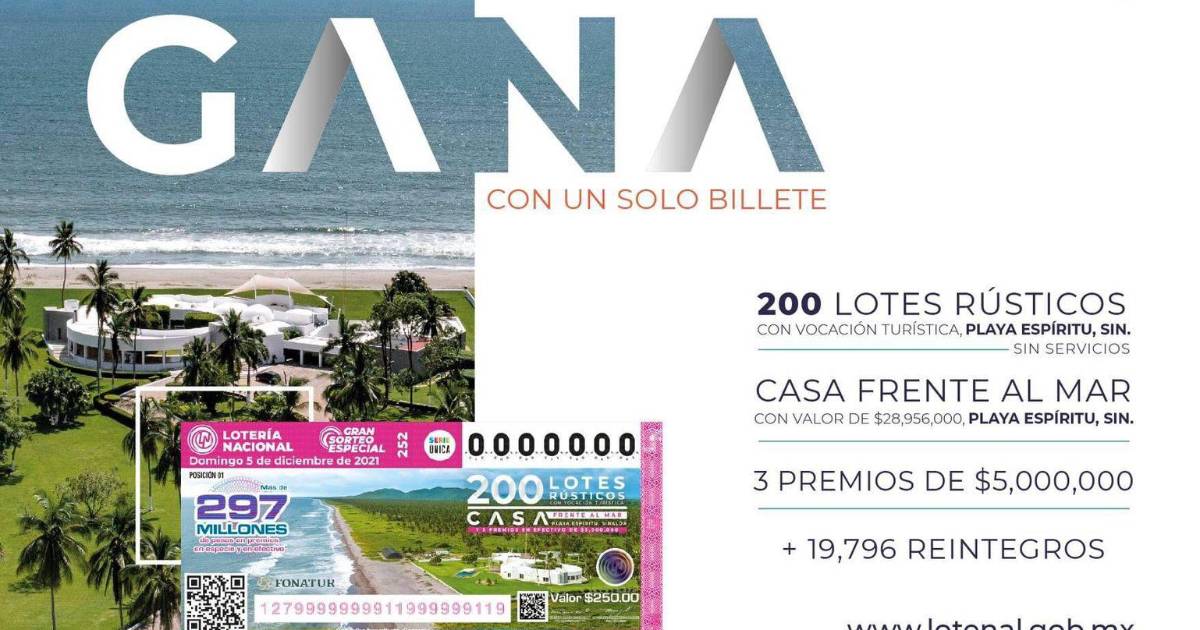 De acuerdo a la página del Gobierno Federal, el sorteo se tiene programado para el 5 de diciembre a las 20:00 horas de este 2021 y ofrece un premio principal de una casa frente al mar en Playa Espíritu. Se desconoce si es la que existe en el lugar y que fue construida por el ex Gobernador Antonio Toledo Corro hace unas décadas.