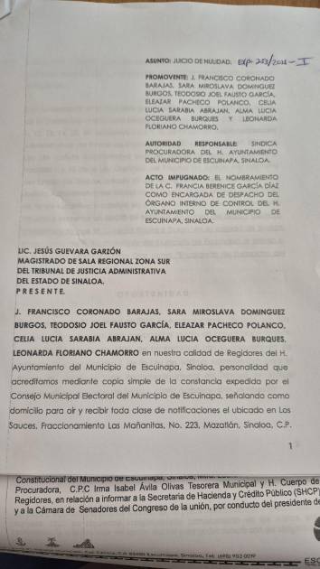 El regidor del PAN, Eleazar Pacheco Polanco informó que acudió ante el Tribunal Administrativo de Mazatlán a interponer el juicio de nulidad en representación de sus compañeros regidores Celia Sarabia Abrajam del PRI, Teodosio Fausto García, Nora Chamorro y Francisco Coronado del PT, además de Lucia Oceguera Burquez del PVEM.