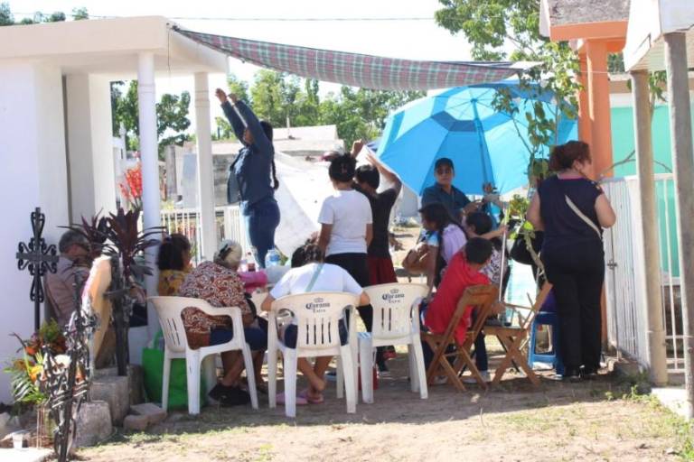 Las carpas abundan sobre los pasillos de un panteón que ha quedado rebasado, por tantas tumbas que se tienen, las risas, las canciones, los rezos se escuchan también.