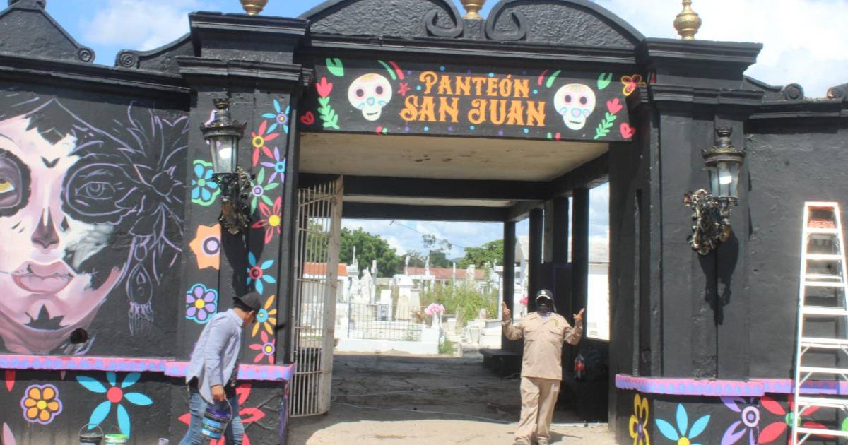 Renuevan fachada del panteón San Juan en El Rosario con motivos de Día de Muertos