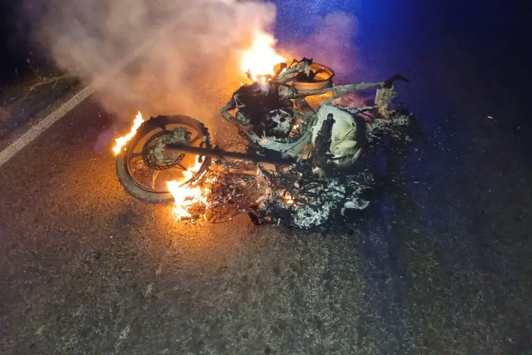 ROSARIO._ Tras recibir reporte de accidente en la carretera estatal a Agua Verde, elementos de socorro se encontraron una motocicleta incendiada abandonada sobre la carpeta asfáltica.