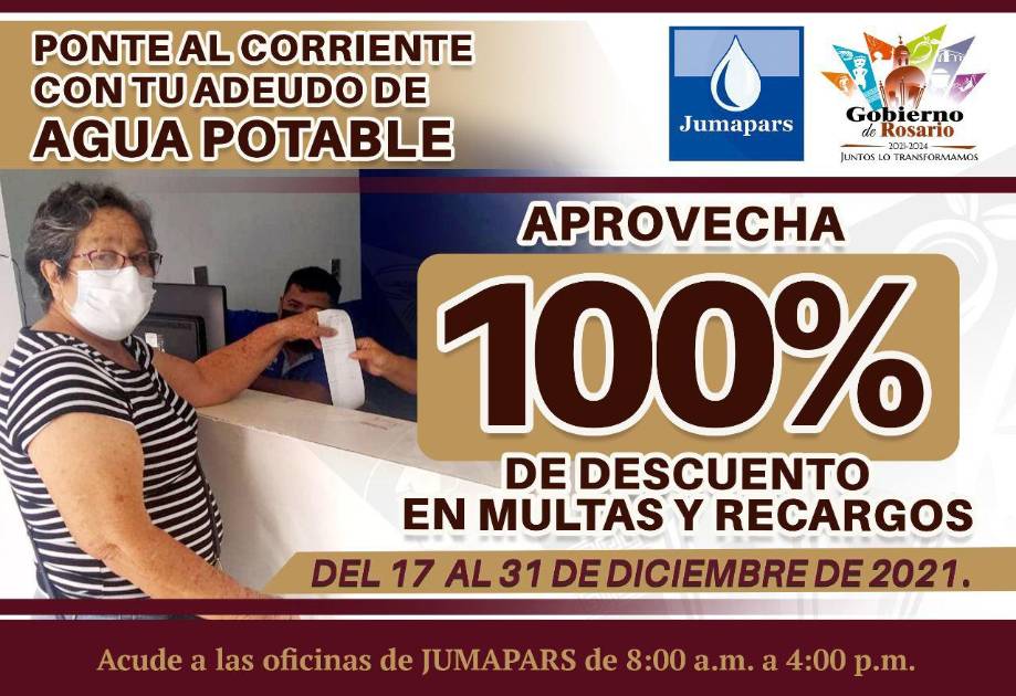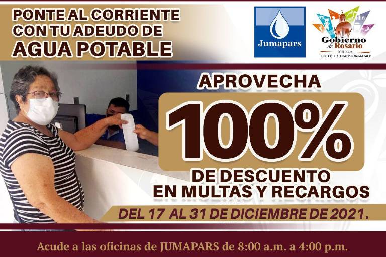 EL ROSARIO._ La Junta Municipal de Agua Potable y Alcantarillado de Rosario informa que del 17 al 31 de diciembre se aplicará el descuento del 100 por ciento en multas y recargos a las personas que presentan adeudos de agua potable. “Los invitamos a que se acerquen a nuestras oficinas para que revisen su adeudo, de igual manera los seguimos invitando a realizar un convenio” enfatizó Cristian Álvarez González, gerente general de JUMAPARS.