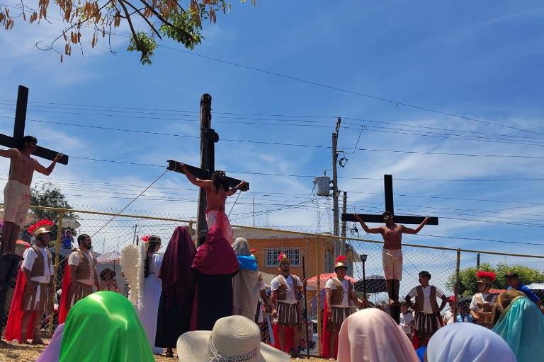 EL ROSARIO._ Con una visible concurrencia fieles del Santuario de Nuestra Señora del Rosario atestiguaron la representación de la pasión de Cristo que recorrió las calles de este pueblo mágico y concluyó en la laguna del Iguanero, en este Viernes Santo.