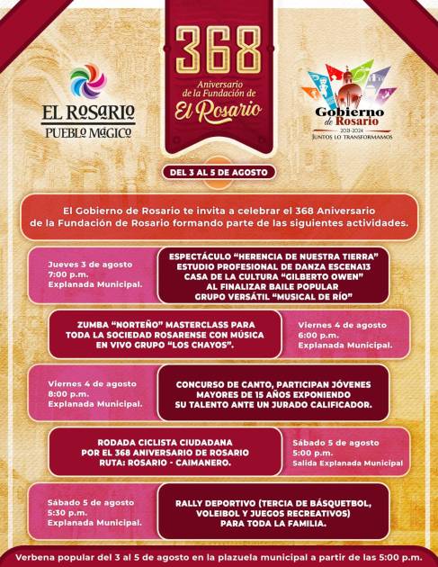 EL ROSARIO._ El gobierno municipal encabezado por la Alcaldesa Claudia Valdez Aguilar tiene preparado un espectáculo artístico, baile popular y eventos deportivos para el disfrute de los rosarenses y visitantes para celebrar el 368 Aniversario de la fundación de El Rosario, las actividades comprenden del jueves 3 al sábado 5 de agosto mismos días en los que se instalará una verbena en la plazuela municipal.