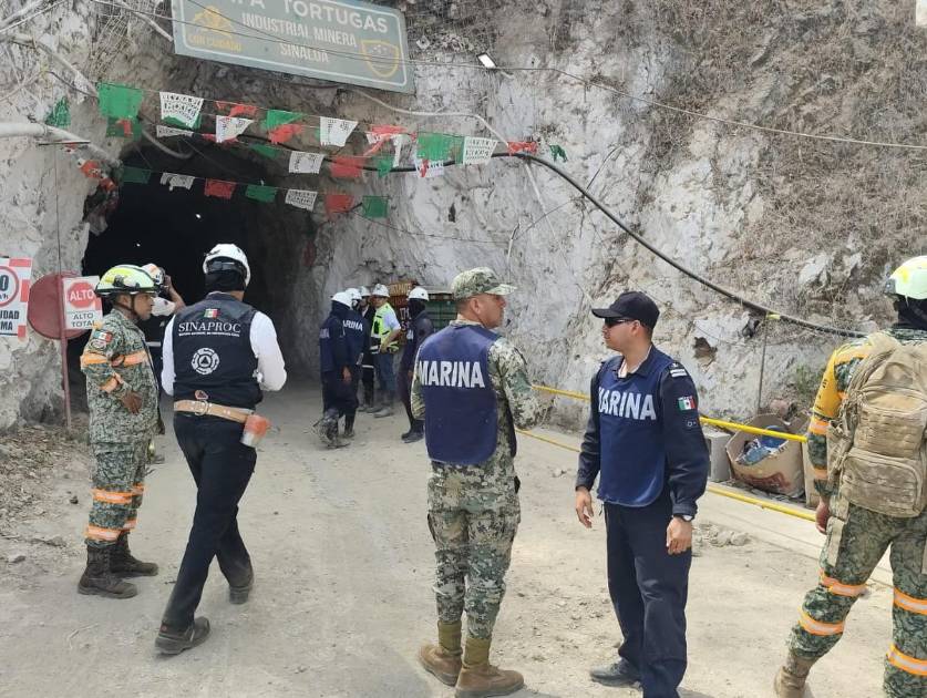 Los trabajos son encabezados por la Coordinadora Nacional de Protección Civil, Laura Velazquez Alzúa, en coordinación con la Sedena, Secretaría de Marina, Protección Civil Sinaloa, CFE Nacional y la empresa minera.