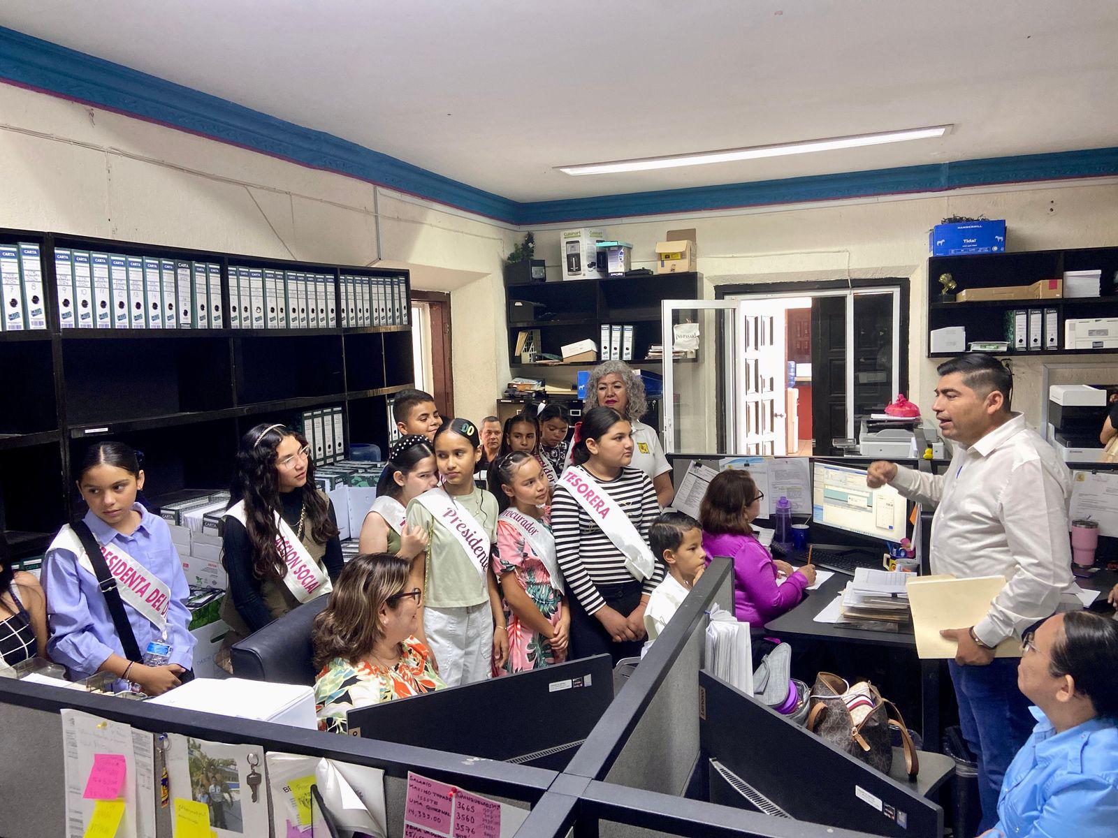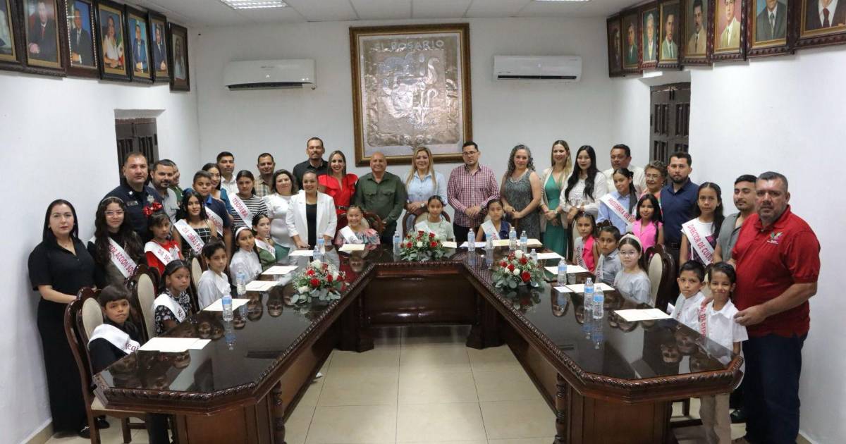 El acto tuvo lugar en la sala del Cabildo local, donde la Alcaldesa Claudia Liliana Valdez Aguilar; el síndico procurador, Virgilio Sánchez; y el cuerpo de regidores, entregaron la banda para acreditar a sus homólogos y ceder funciones a los pequeños.