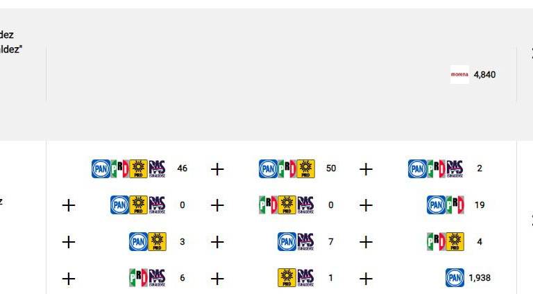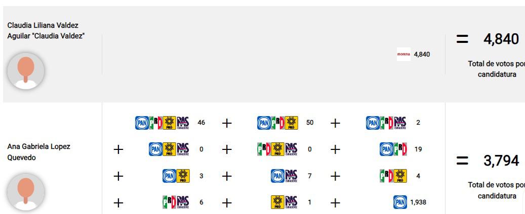 Con el 72.1792 por ciento de las actas capturadas hasta las 5:40 horas de este lunes 3 de junio, hasta este momento Valdez lleva 4 mil 840 votos, lo que significa el 36.8818 por ciento.