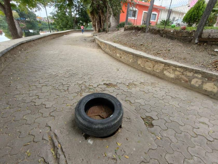 Debido al riesgo que existe de que una persona pise y caiga al interior de la alcantarilla al estar rota la tapa, los propios vecinos del lugar optaron por colocar una llanta.