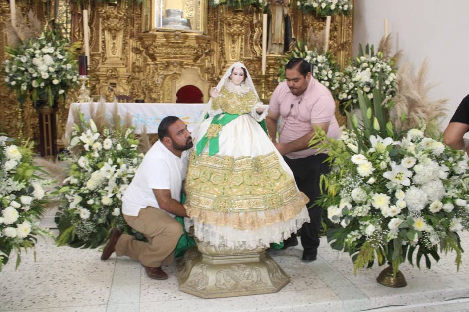EL ROSARIO._ Con el atuendo titulado “María, madre de la fe y la esperanza”, donado por la familia García Osuna, la jefa de familia, la señora María Guadalupe Osuna Cazares, se iniciaron los preparativos para la solemnidad de Nuestra Señora del Rosario 2025.
