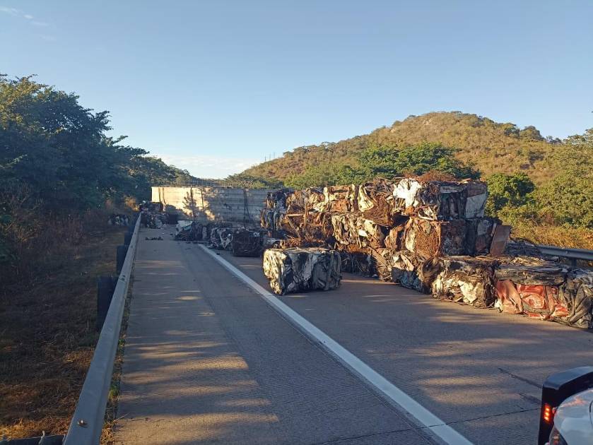 Vuelca tráiler cargado de chatarra y obstruye la autopista a la altura de Rosario