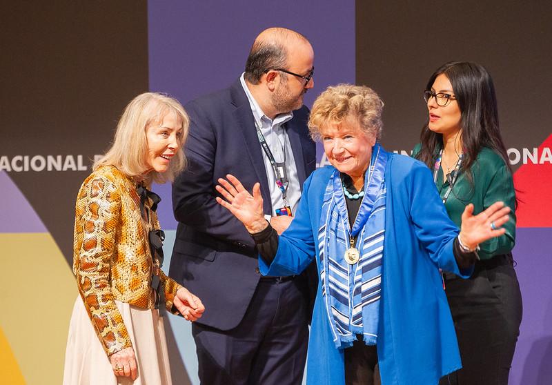 La escritora italiana Dacia Maraini recibió la medalla Carlos Fuentes durante la apertura del Salón Literario Carlos Fuentes de la edición 37 de la Feria Internacional del Libro (FIL) de Guadalajara, en una ceremonia presidida por el Rector General de la Universidad de Guadalajara, doctor Ricardo Villanueva Lomelí y la viuda de Carlos Fuentes, Silvia Lemus.