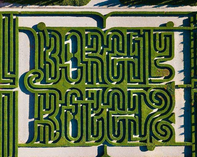 Hasta ahora era visible desde uno de los edificios que lo rodean, desde la terraza del Centro Branca, desde donde se puede ver, entre las plantas de boj de noventa centímetros de altura, una serie de símbolos que recuerdan las obras de Borges: dos relojes de arena, un enorme signo de interrogación, el tigre, el nombre de Jorge Luis y las iniciales de María Kodama y los setos dispuestos para formar el nombre de Borges.