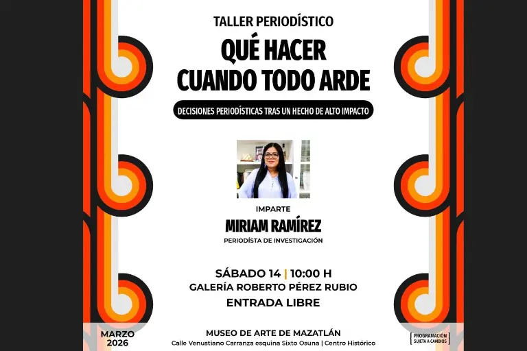 MAZATLÁN._El Museo de Arte de Mazatlán será anfitrión del taller periodístico “Qué hacer cuando todo arde: decisiones periodísticas tras un hecho de alto impacto”, que se realizará el próximo sábado 14 de marzo de 2026, de 10:00 a 13:00 horas, en la Galería Roberto Pérez Rubio, con entrada libre.