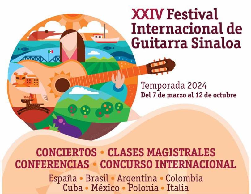 Esta vez con un formato de temporada, a partir del 7 de marzo en Los Mochis, y hasta el 12 de octubre próximo se llevará a cabo el 24 Festival Internacional de la Guitarra Sinaloa 2024, con músicos de España, Brasil, Argentina, Colombia, Cuba, Italia, Polonia y México, y con actividades como 21 conciertos, seis clases magistrales, dos conferencias y el Concurso Internacional de Guitarra Culiacán.