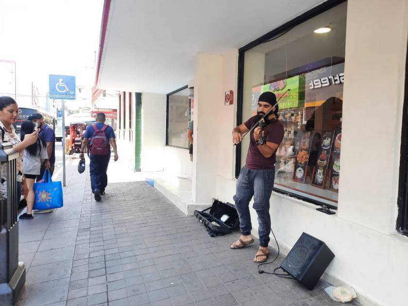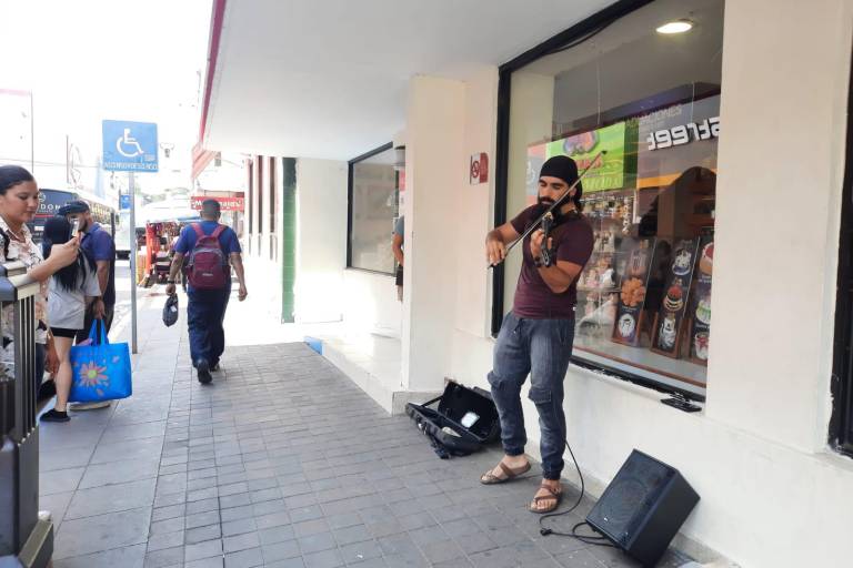 MAZATLÁN._ De pie a las afueras de una sucursal de restaurante y pastelerías Panamá, o afuera de una tienda departamental frente a la Catedral por la calle Benito Juárez, Alain Cheiner Valencia Rea toca con pasión el violín para las personas que caminan por las calles del transitado Centro de Mazatlán.