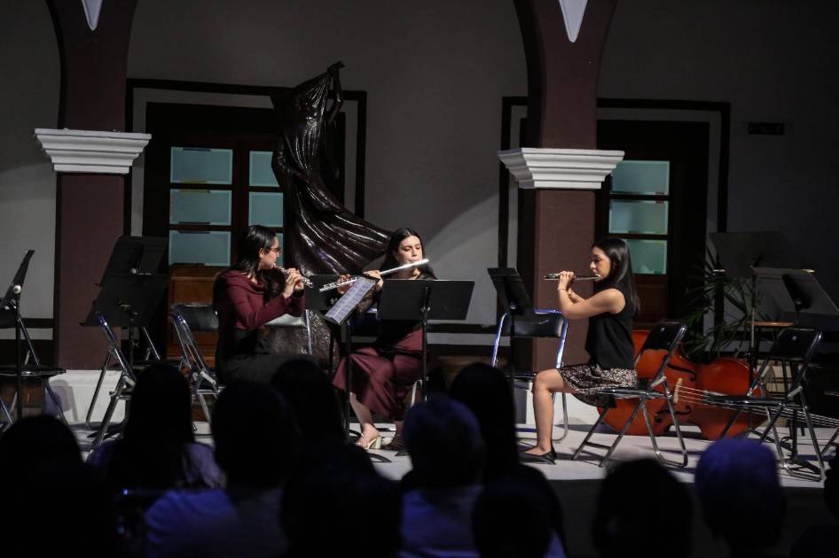 El talento femenino se hizo presente con el Trío de Flautas, conformado por Paola Sánchez, Elizabeth Russel y Gabriela Juárez, bajo la dirección del maestro Plamen Petkov, quienes deleitaron al público con el Divertimento, para tres flautas, de Joseph Haydn, incluyendo sus movimientos Allegretto con variaciones y Minueto.