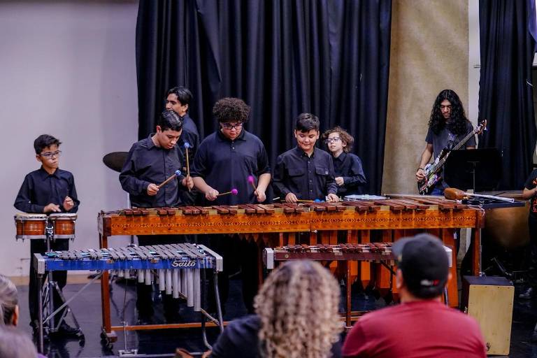 Alumnos del taller y carrera técnica en percusiones del Centro Municipal de las Artes demostraron sus avances musicales y dominio de repertorio e instrumentos de percusión durante una clase abierta en el Foro Experimental del Centro Municipal de las Artes.