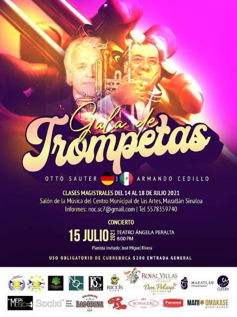 Bajo el nombre “Gala de trompetas”, Sauter y Cedillo junto al pianista José Miguel Rivera, brindarán un magnífico concierto el cual iniciará a las 20:00 horas.