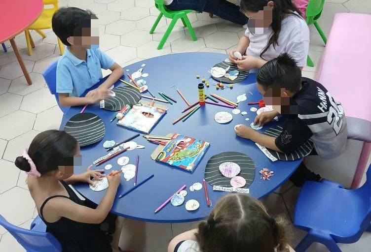 Para continuar con la temática, los niños, con la ayuda de sus padres, crearon su propio sistema solar. Utilizando palillos, cartulina, colores, cinta, plastilina y figuras de planetas proporcionadas por Karime, los pequeños colorearon, pegaron y ensamblaron sus maquetas. Esta actividad práctica no solo fue divertida y didáctica, sino que también buscó despertar un interés más profundo en la astronomía de una manera creativa.
