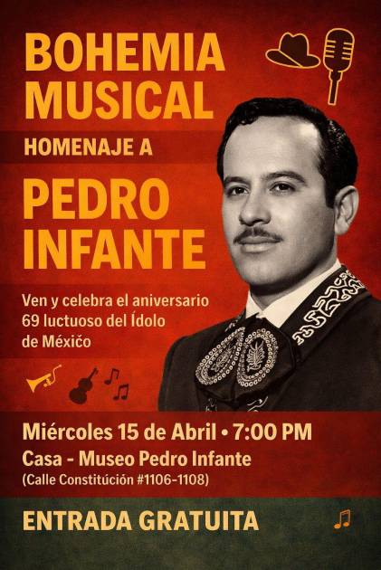 La música y la nostalgia se darán cita este miércoles 15 de abril en la Casa Museo Pedro Infante, donde se llevará a cabo una bohemia musical en honor al cantante sinaloense, al cumplirse 69 años de su fallecimiento.