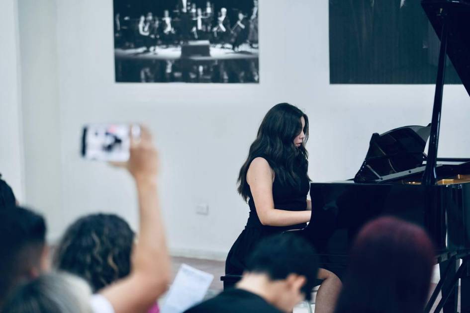 La velada culminó con la actuación de Perla Orozco, estudiante del Nivel Técnico. Sus interpretaciones del “Minueto en Sol” de Bach y el “Preludio en La” de Chopin le valieron un fuerte aplauso del público. Orozco compartió el aplauso con sus compañeros, quienes se unieron a ella en el escenario para agradecer la cálida recepción.