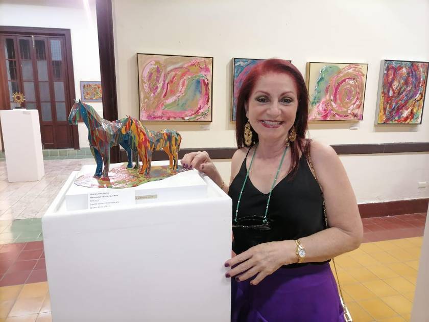 La expositora, quien también forma parte del Patronato de la institución, se dio a la tarea de montar esta exposición, en la cual muestra 42 pinturas, 11 esculturas y una instalación en cuya composición integra cuatro figuras y un poemario.